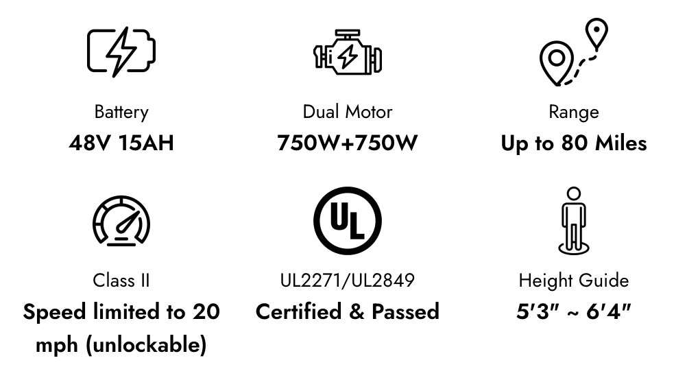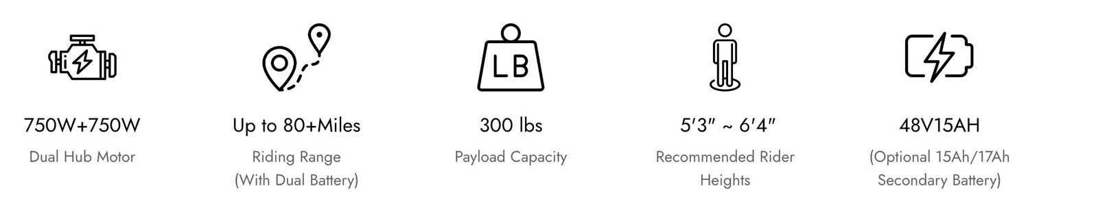 - Battery: 48V15Ah + Optional 15Ah/17Ah battery (Dual battery design)