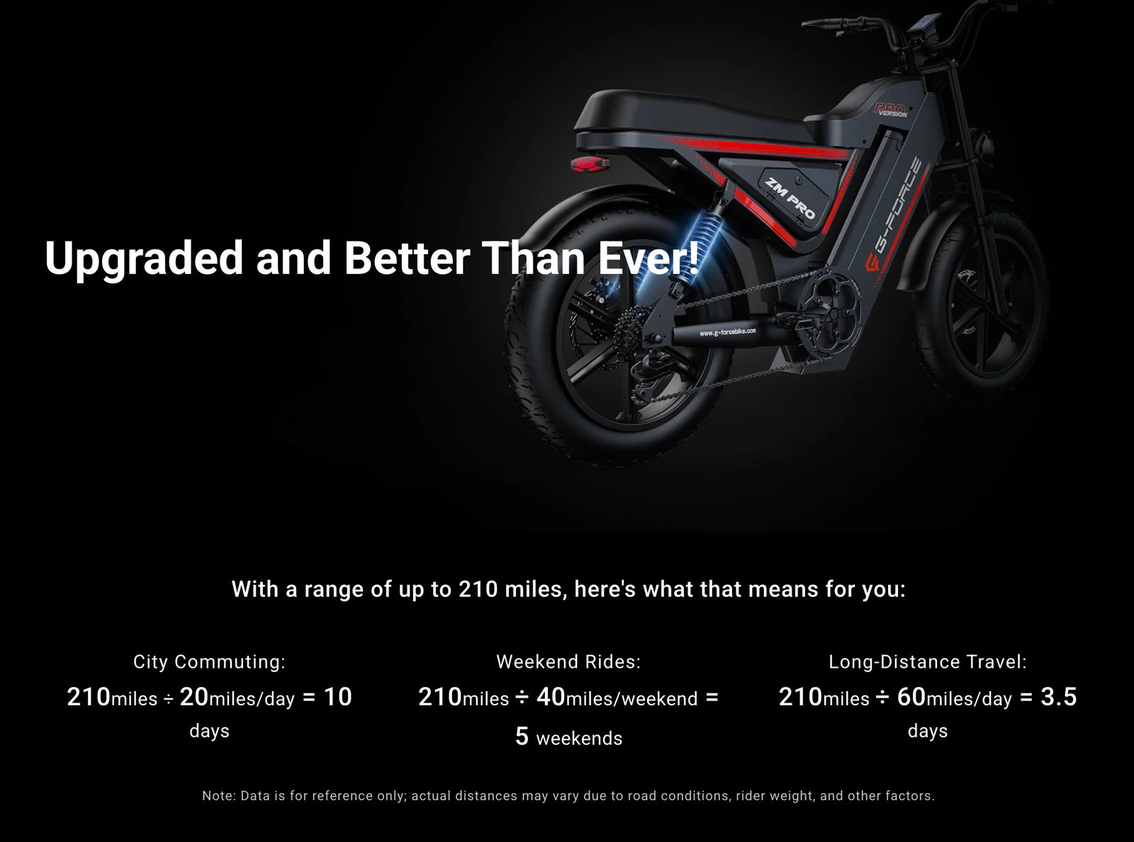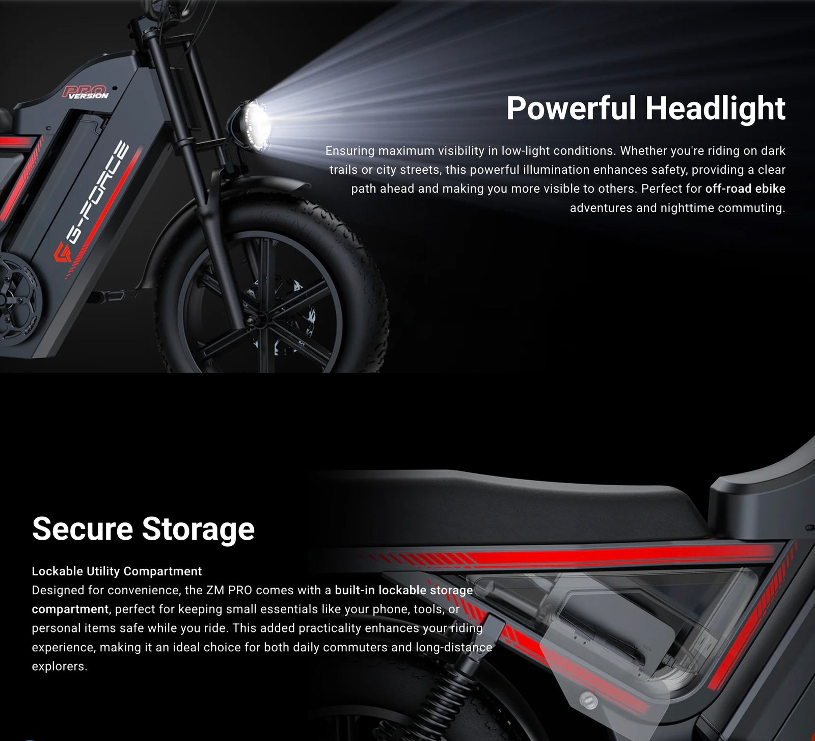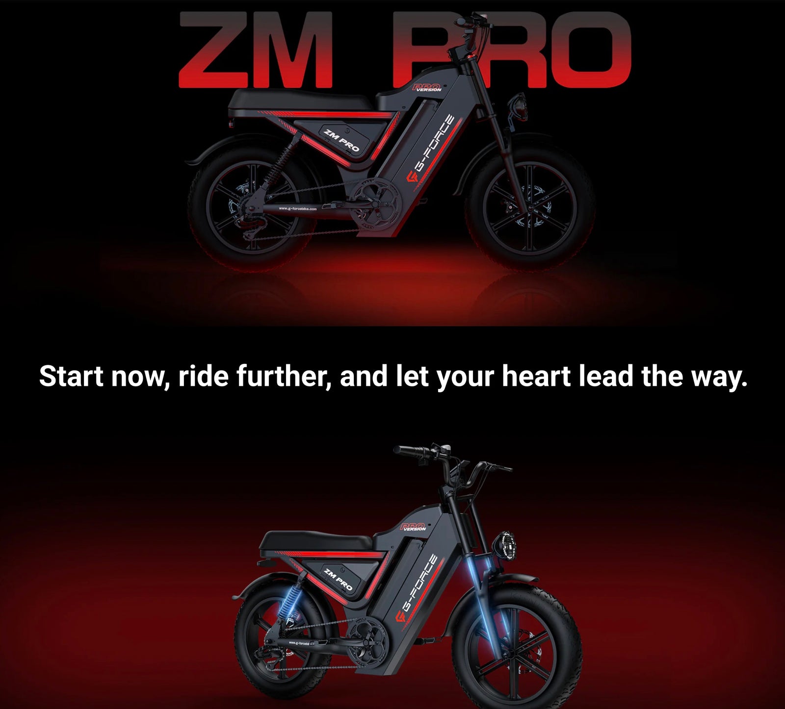 The G-FORCE ZM PRO is more than just an electric bike; it's a statement of style, power, and endurance. Its remarkable range, combined with a potent motor and a comfortable full-suspension ride, makes it ideal for anyone seeking an electric bike that performs like a light motorcycle but offers the versatility of an ebike. Experience the freedom of the open road, or the ruggedness of the trail, all with the distinctive presence of the ZM PRO