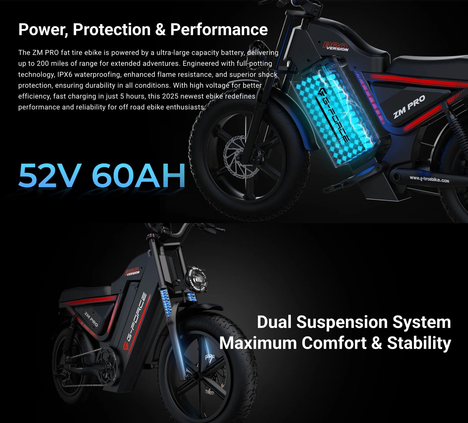 G-FORCE ZM PRO| 1500W Peak, 200-Mile, Full Suspension Fat Tire E-Bike