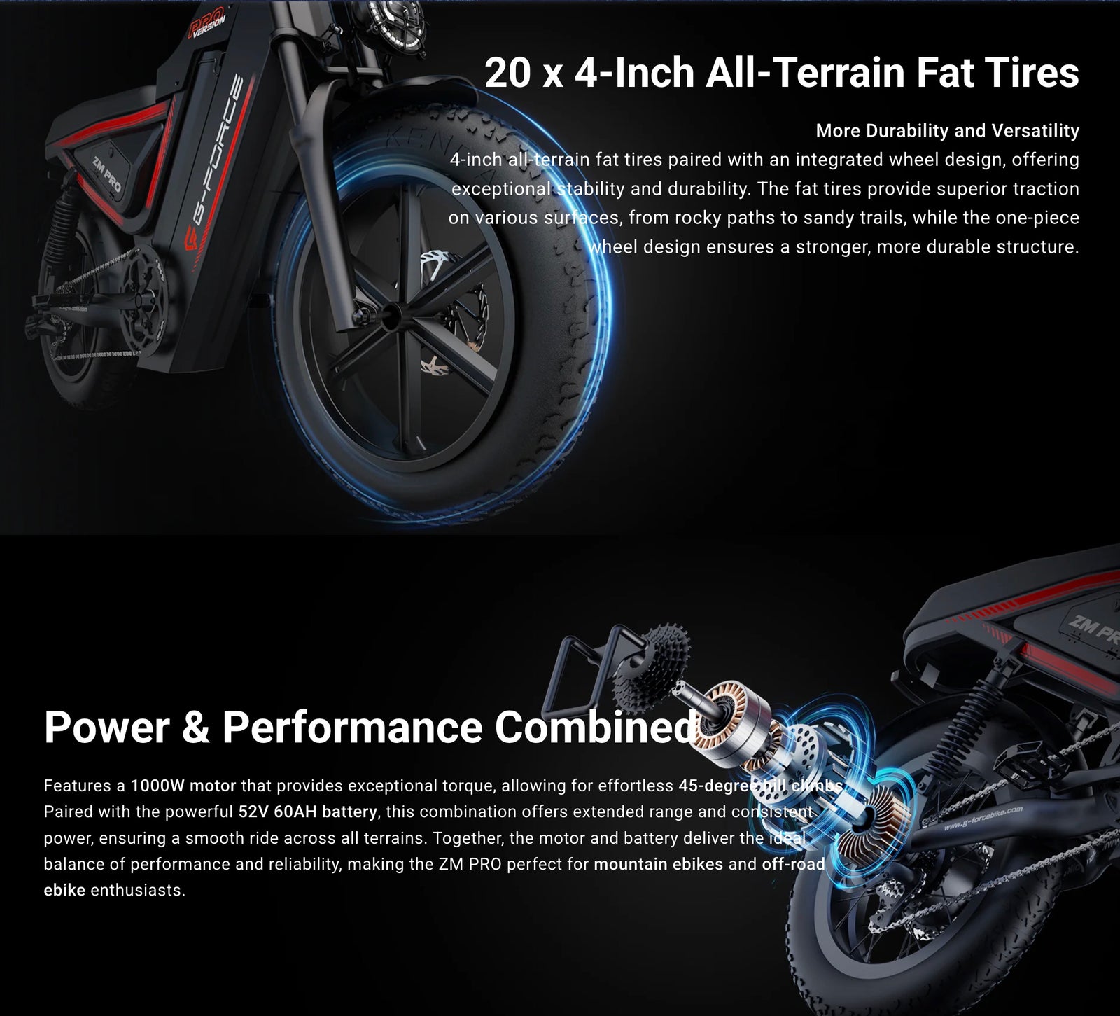 - Blazing Top Speed: Achieve an exhilarating top speed of up to 34 MPH, making the ZM PRO one of the fastest electric fat tire bikes in its class.