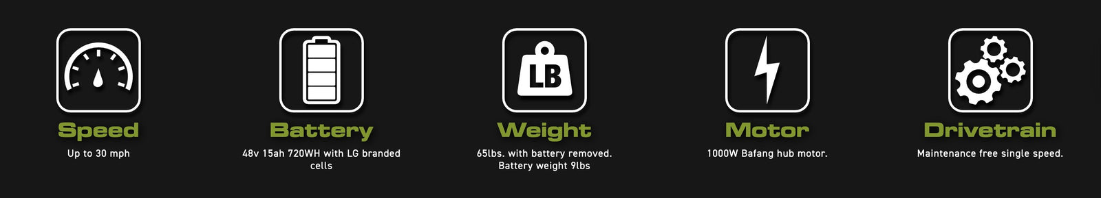 48V 15Ah (720Wh) Battery (upgradeable): The standard 48V 15Ah LG or Panasonic cell battery provides up to 48 miles of range.