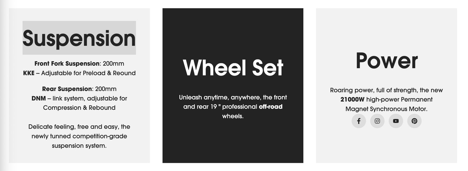 Suspension | • Front: 200 mm KKE (Preload & Rebound Adjustable) • Rear: 200 mm DNM (Compression & Rebound Adjustable) |