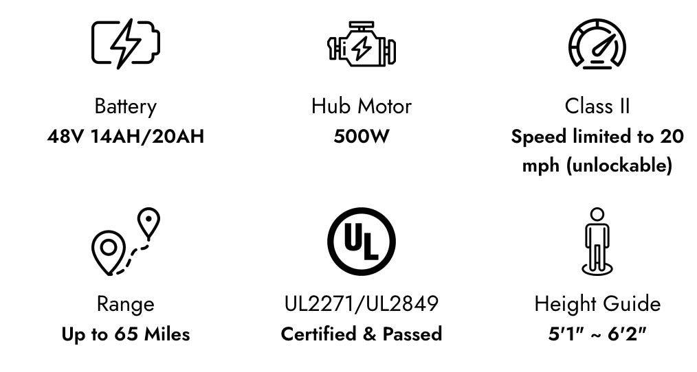 - 500W Geared Rear Hub Motor (65 Nm Torque): Experience consistent power and smooth acceleration from the 48V 500W geared rear hub motor, delivering a max 65 Nm of torque. This ensures you can confidently navigate city streets and moderate hills, even when fully loaded.