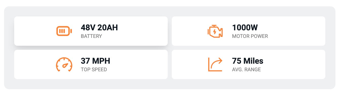 - Range: Avg. 75 Miles* on PAS, up to 85 Miles on Level 1, 60 Miles* on Throttle ( Range Per Charge is measured under the conditions that power is sufficient, with a 75kg load, at 86°F(30°C), 70% humidity, on a level road, in pedal assist mode with level 1 assistance, and in pure electric riding mode by throttle. Actual results may vary based on differences in temperature, load, wind speed, road conditions and other factors.)