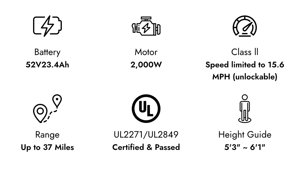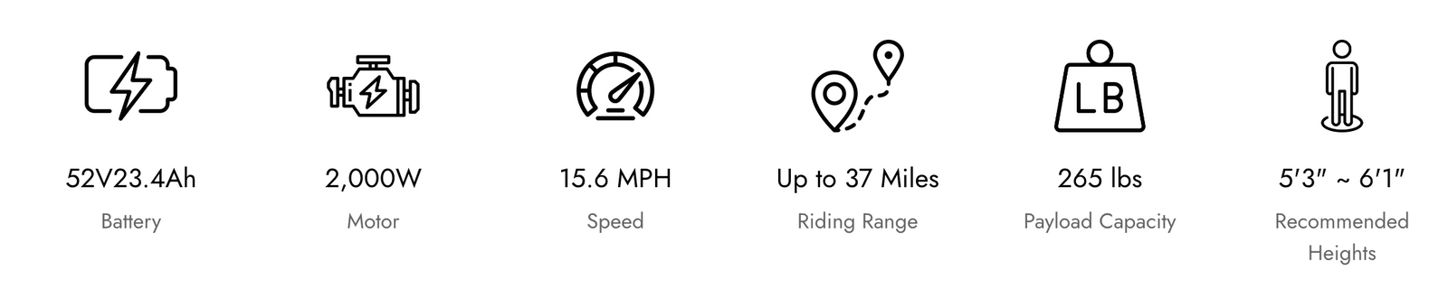 2000W Powerful Brushless Motor (52V): Experience incredible thrust with a mighty 2000W powerful brushless motor that effortlessly propels you across diverse terrains. This high-power electric scooter ensures you're never held back by difficult conditions.