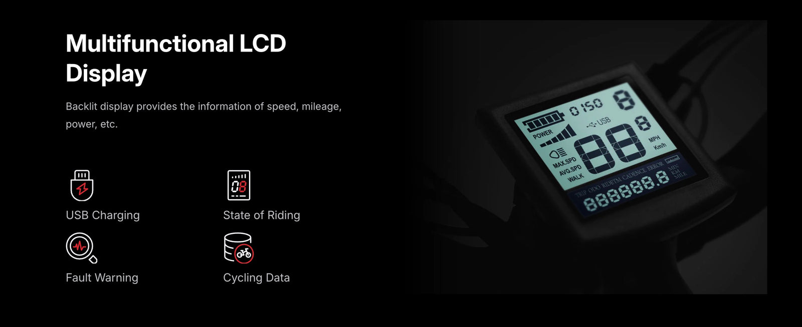 Equipped with an intuitive multifunctional LCD display with USB charging, you can easily monitor your ride data and power your devices. Safety features like a bright 48V Luminosity Spotlight and an integrated brake light enhance visibility, while 180MM mechanical disc brakes provide reliable stopping power in all conditions. The Shimano 7-speed gear system offers versatile control for different terrains.