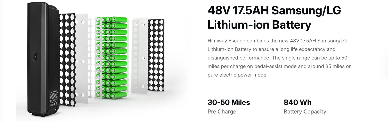 At the core of the Himiway Escape Pro is a powerful 750W brushless gear hub motor, delivering exceptional torque (80Nm) for swift acceleration and effortless hill climbing. Paired with a high-capacity 48V 17.5Ah (840Wh) Samsung/LG Lithium-ion battery, you can expect an impressive 30-50+ mile range on a single charge, making it perfect for extended commutes or weekend getaways.