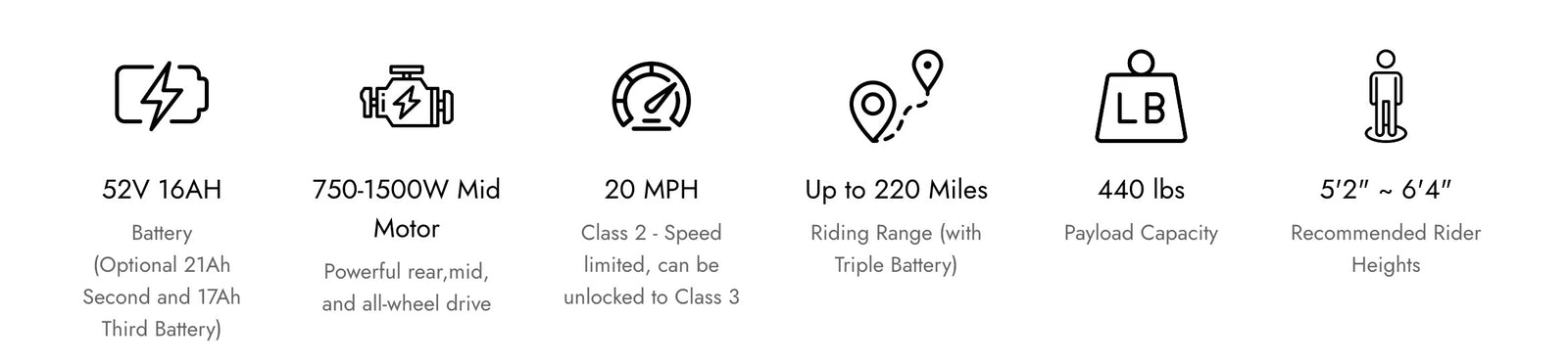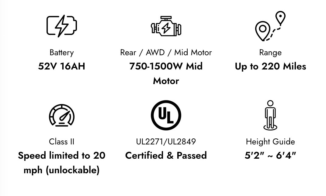 Motor Options: 750W Rear Hub / 1000W Mid-Drive / 1500W Dual 750W AWD