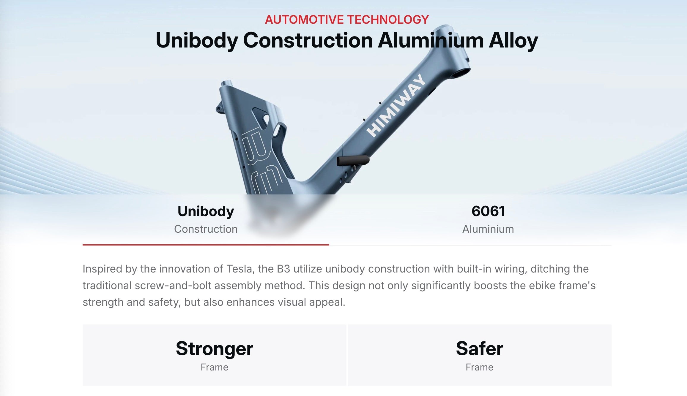 Despite its compact size, the Himiway B3 doesn't compromise on comfort or stability. Its 20" x 2.4" tires offer a smooth and stable ride, absorbing road imperfections.The unibody construction with a 6061 aluminum front frame and A356 steel rear ensures exceptional durability and safety.Mechanical disc brakes provide reliable stopping power in all conditions.