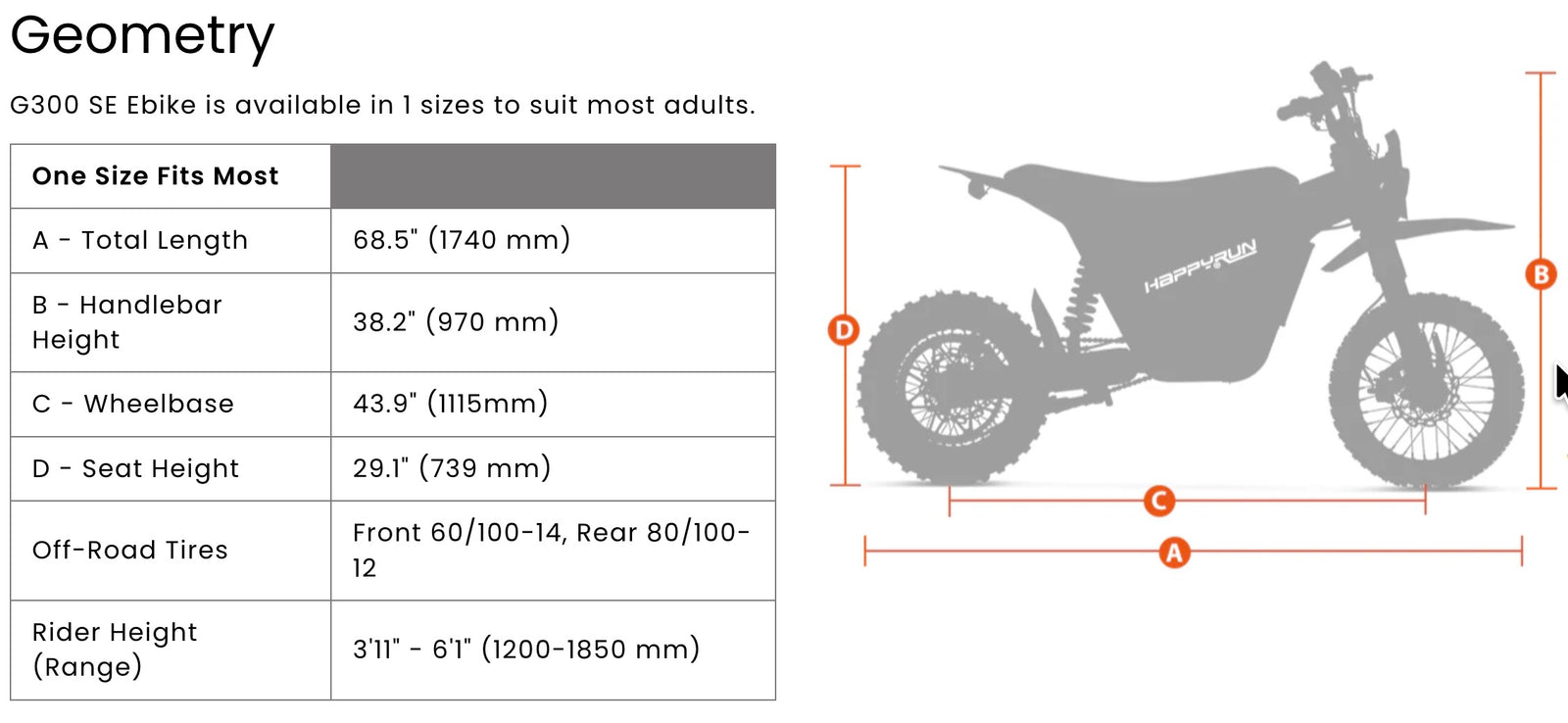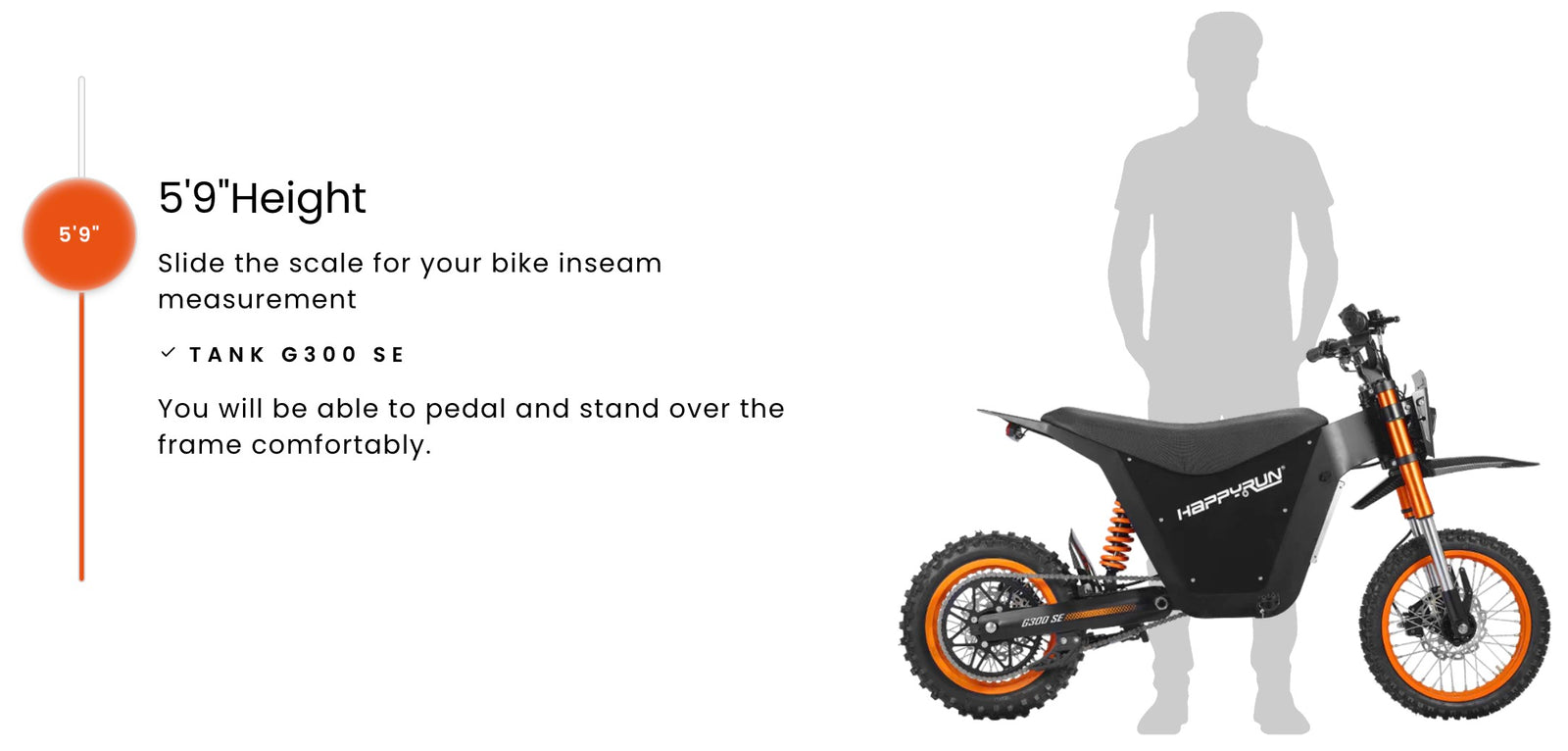 HappyRun G300 Pro electric dirt bike recommended rider height is 5'1" ~ 6'5", payload 350 lbs at maximum. The seat height of G300 Pro is 31 inches.
