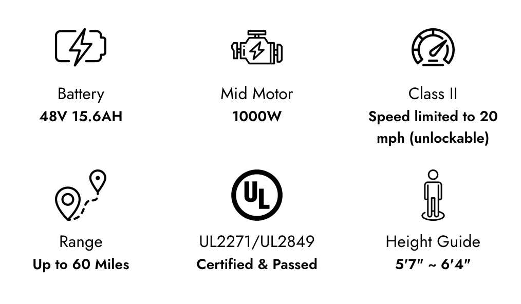 - Motor: 48V1000W BAFANG brushless mid motor with 160 N.m torque
