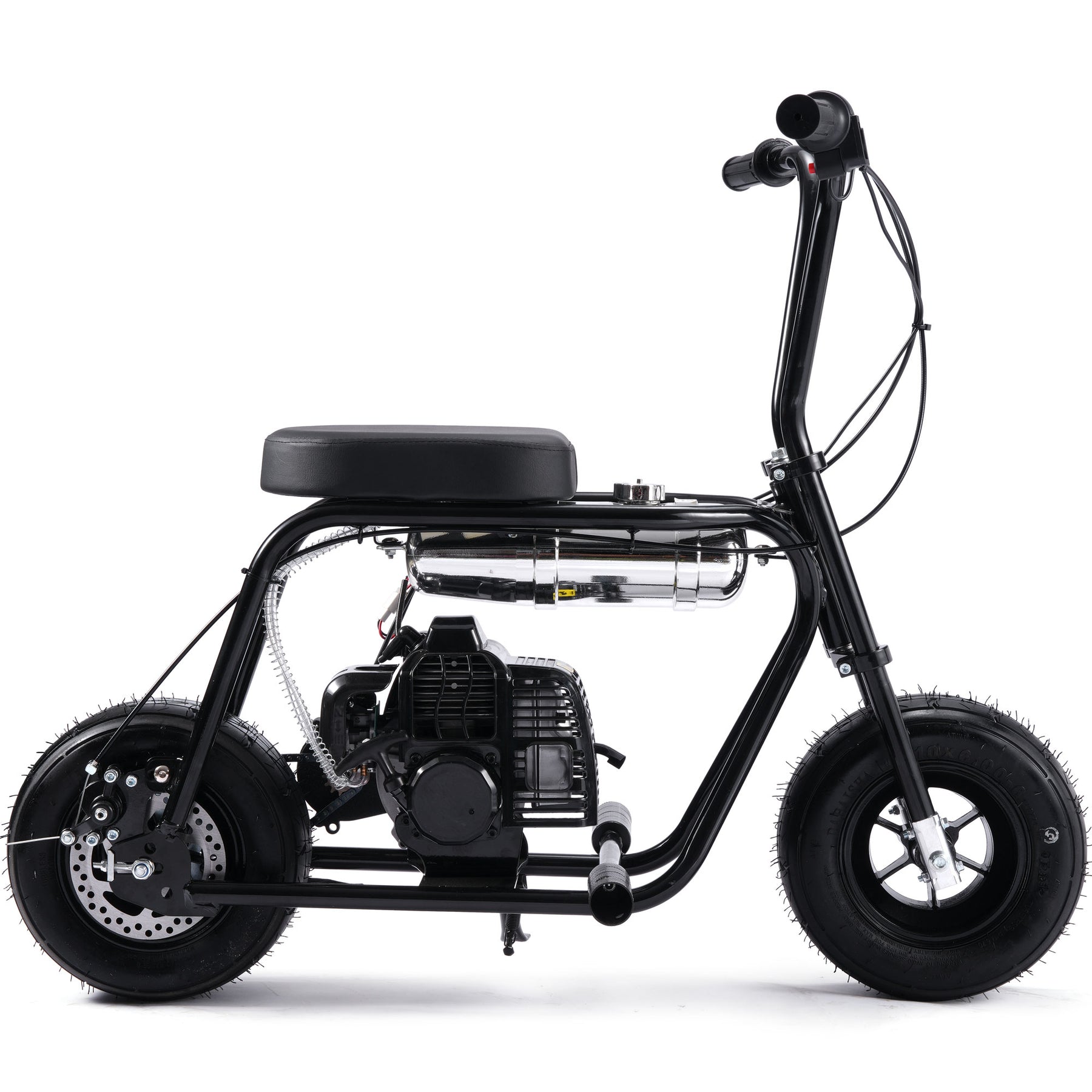 The MotoTec 49cc Wild Rover Gas Mini Bike. Just like the ones your parents used to drive, only safer and easier to use. Powered by a 49cc 2-Stroke engine and automatic clutch to ensure easy operation. Just twist the throttle and go, perfect for beginner riders. This little monster packs a punch, perfect for cruising in the yard or dirt trails with its large wide air-filled knobby tires.