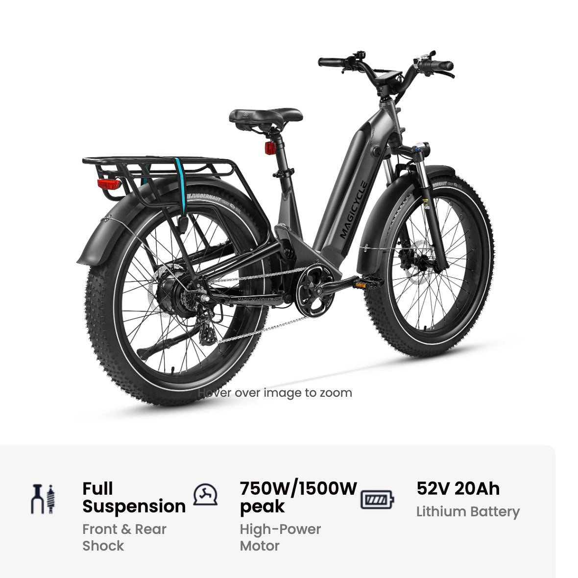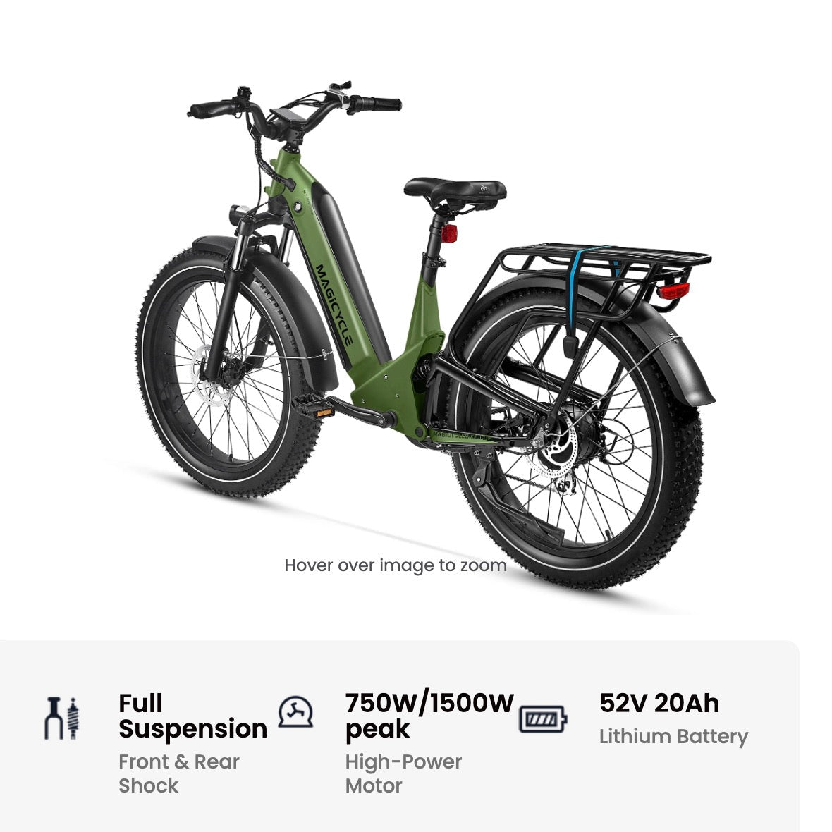 Redefine your ride with the Magicycle 26" Deer Step-Thru Full Suspension Ebike SUV, an innovative electric bike designed for unparalleled comfort and versatile performance across any terrain. Combining the ease of a step-through frame with the plush ride of a full suspension system and the stability of 26-inch fat tires, the Magicycle Deer offers an "SUV-like" experience on two wheels. Whether you're navigating urban jungles, cruising bumpy paths, or exploring light trails, this Ebike SUV ensures every journey is smooth, powerful, and effortlessly enjoyable.