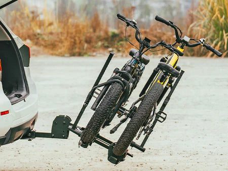 1. To improve stability, be sure to remove the front basket before mounting your ebike on the hitch rack, and fasten all straps and telescoping bar clips to the frame or wheels.