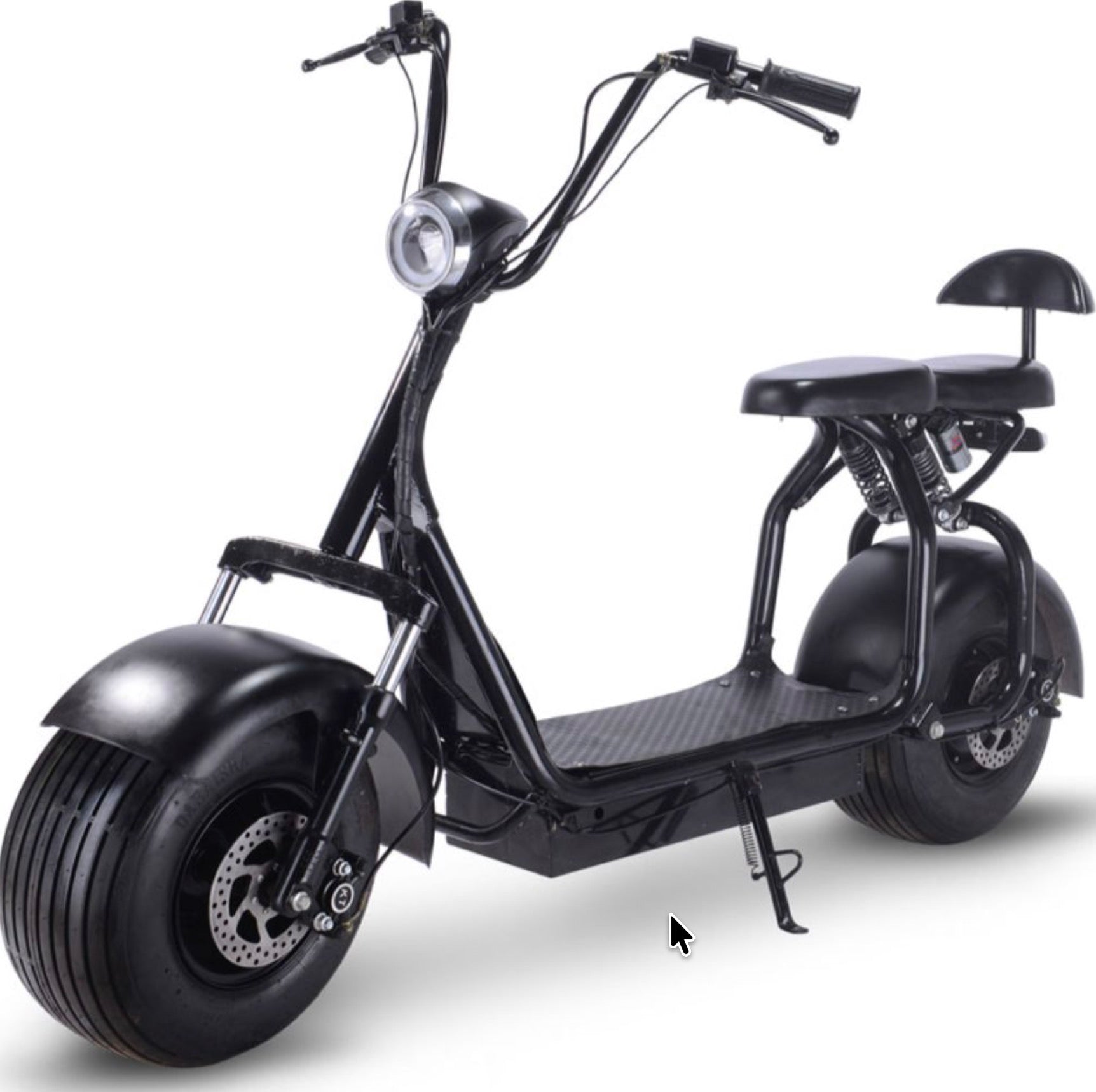 Introducing the new MotoTec Knockout 60 Volt 1000w Electric Scooter. This powerful hub motor, powered by Five 12v 12ah Lead Acid Batteries can reach speeds of 25mph and travel up to 20 miles per charge. Equipped with a Front & Rear LED light, Front & Rear Shocks, Front & Rear Hydraulic Brakes, Hugh Tires and Double Seat with backrest. This scooter is ready to tackle any terrain.
