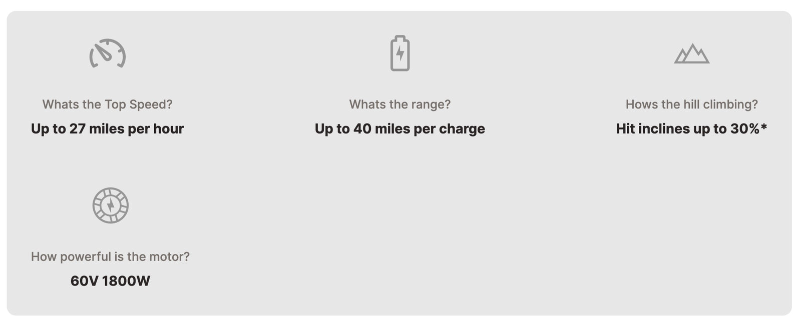 The CycleBoard Rover is equipped with a near silent 60v 1800w direct-drive brushless hub motor to provide significant torque for hill climbing & rapid acceleration. Ride up to speeds of 27MPH.