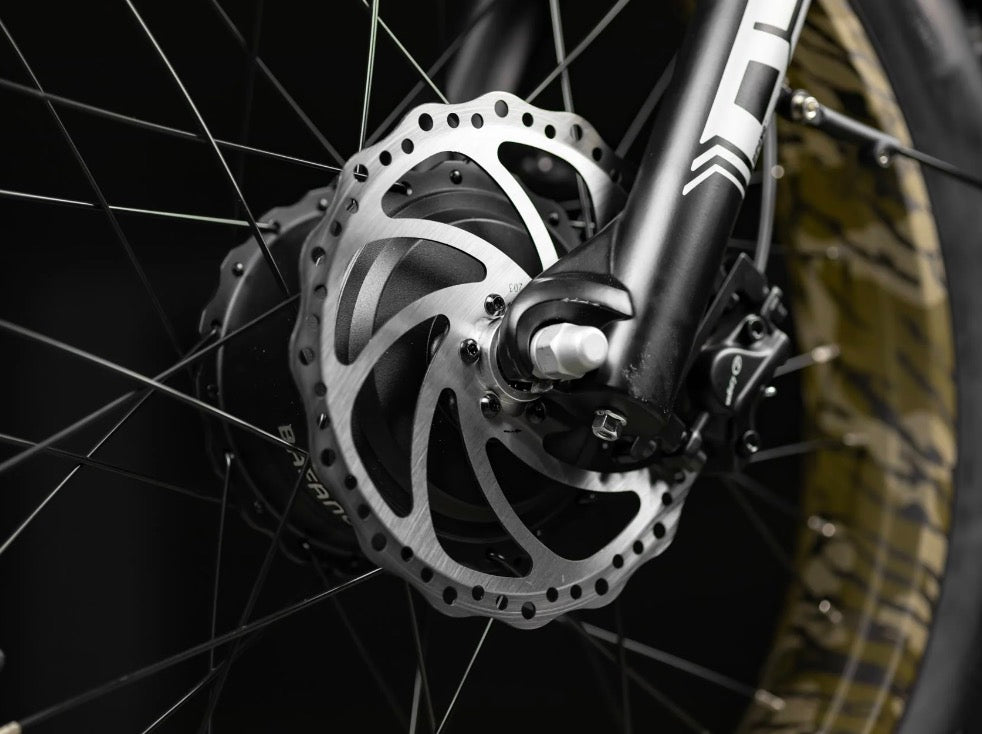 - Extreme Duty Tektro 4-Piston Hydraulic Brakes (203/180mm Rotors): A heavy bike with immense power requires elite stopping. The Tektro HD-E740 4-piston hydraulic disc brakes provide significantly more clamping force and better heat management, ensuring consistent, reliable stopping power on long descents and in emergency situations. Includes electric safety cutoff and noise reduction pads.