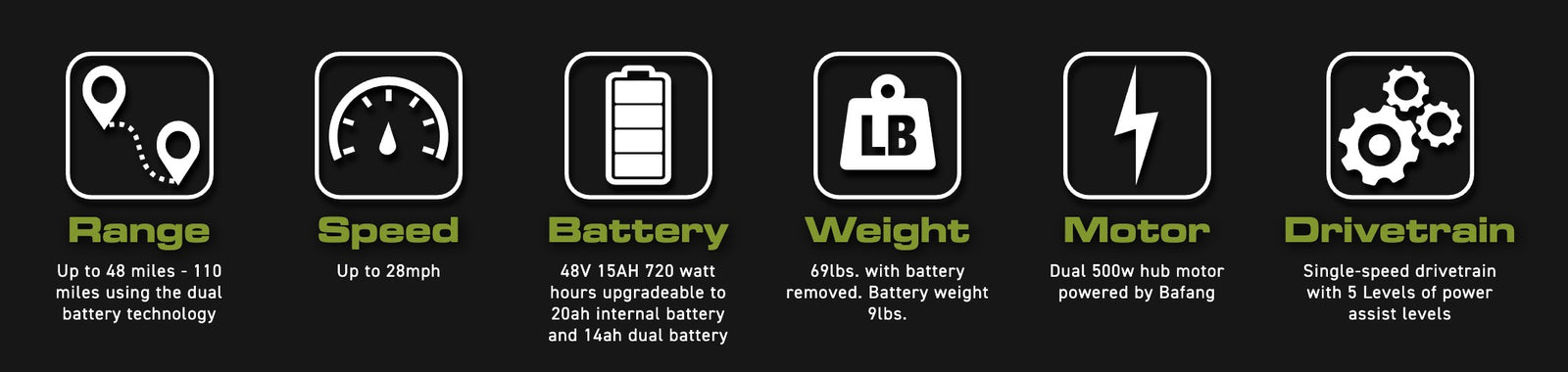 UPGRADE: Ability to add an additional 14ah R138 14-DB battery—Take your travel to the next level. Increase your total range by up to 65 miles using Pedal Assist or 32 miles with throttle only.